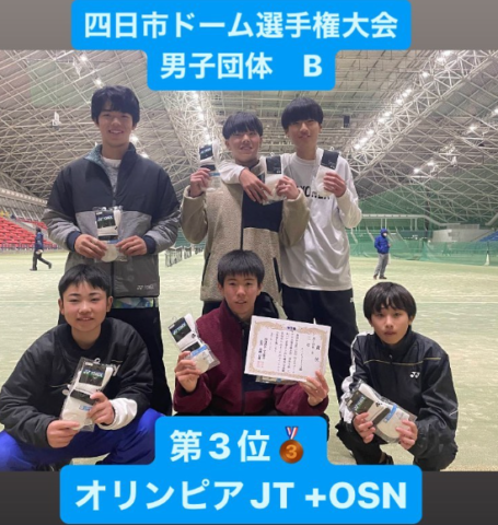 四日市ドーム選手権大会にて女子団体に引き続き、男子団体ではオリンピアテニススクールジュニアトーナメントクラスの選手たちが素晴らしい成績を残してくれました❗️男子団体 B第3位🥉 オリンピアJT +OSN左上から永井伶選手 後藤安就選手 池本...